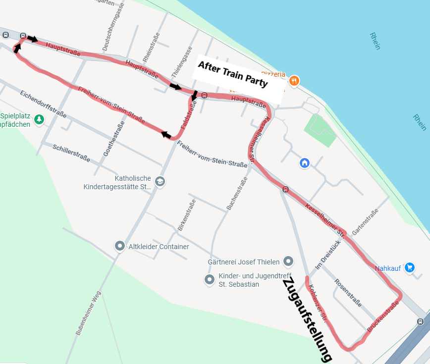 Der Umzug wird folgende Strecke nehmen: Aufstellung in der Koblenzer Straße, danach führt er durch die Brückenstraße, Kesselheimer Straße, Hauptstraße, Feldstraße, Freiherr-v-Stein-Straße, Mülheimer Weg, Hauptstraße bis zur Mehrzweckhalle. Dort löst sich der Zug dann auf und unser KV Helau e.V. lädt uns zur "After-Train-Party" in die Halle ein.