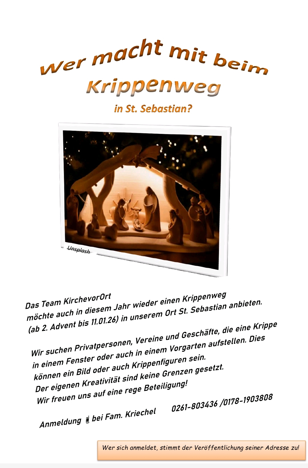 auch in diesem Jahr plant die Kirche vor Ort wieder einen Krippenweg. Weitere Informationen hierzu finden Sie auf dem beigefügten Plakat.